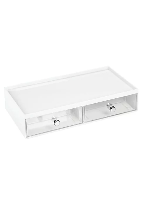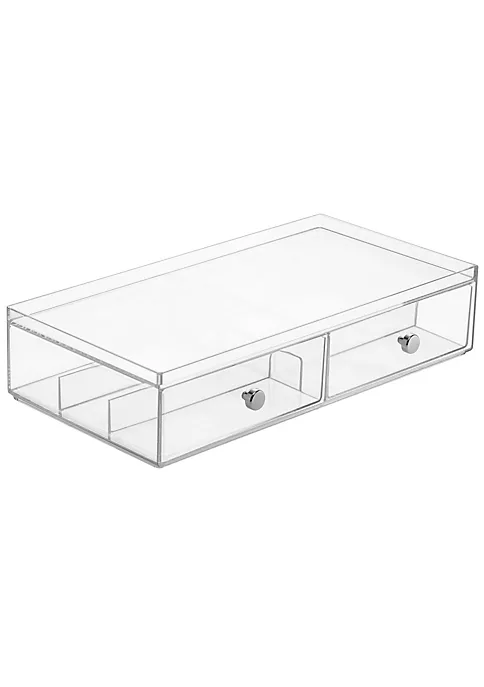 DIVIDED STORAGE DRAWERS: Each compact drawer organizer center features 2 drawers that have been divided into 3 sections.STACKABLE: Organizers are stackable to create space-saving, vertical storage.FUNCTIONAL & VERSATILE: Works well on counters, in cabinets, closets and more; Great for small spaces.QUALITY CONSTRUCTION: Made of durable plastic; Knobs made of metal with a chrome finish.EASY CARE: Clean with mild soap and water; Do not place in dishwasher.THOUGHTFULLY SIZED: Each Measures 7″ x 12.75″ x 2.75″ high.