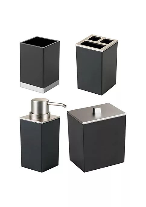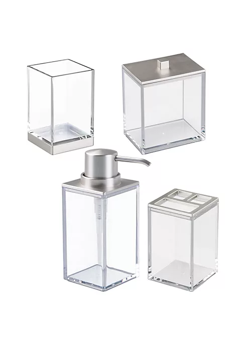 4 PIECE SET: Includes a tall soap pump; tumbler cup; divided toothbrush holder; lidded storage canister.
