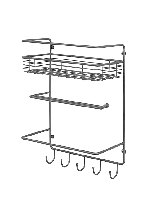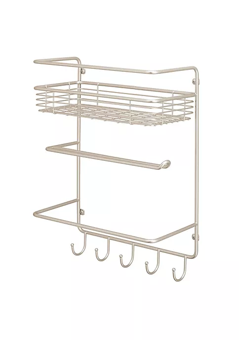 Dispenses one paper towel roll and features a top shelf and 4 hooks for additional storage.