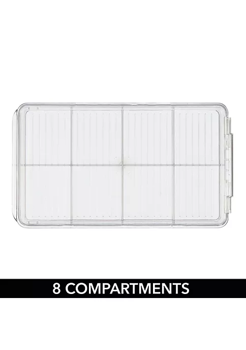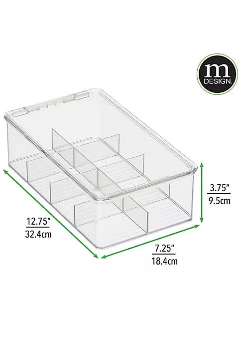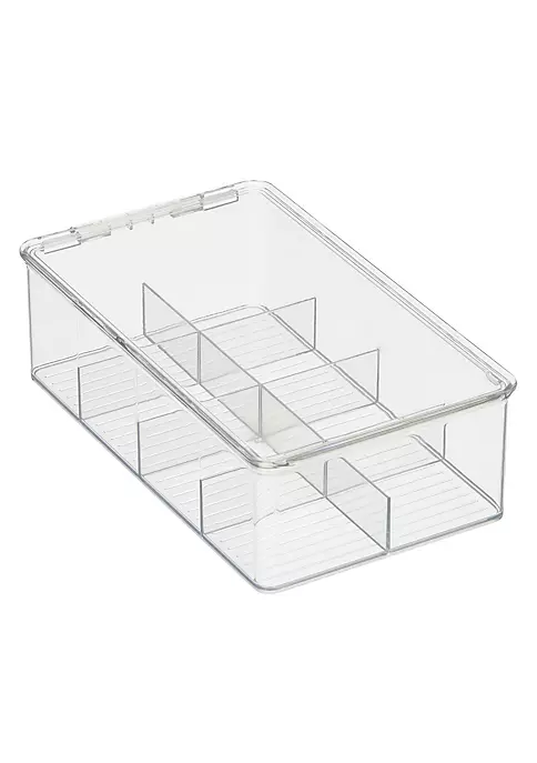 HINGED LID: Hinged lid easily opens to make grabbing what you need simple; Clear construction makes it easy to see what is stored inside; Stack organizers to create space-saving vertical storage.