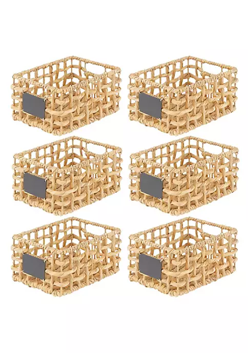 Baskets have integrated, built-in handles making them easy to pull on and off of shelves.Bins come with reusable chalkboard label that makes contents easy to identify.Wipe clean with a damp cloth.Made from natural hyacinth in an open weave design.Dimensions 9″ x 12″ x 6″ high.