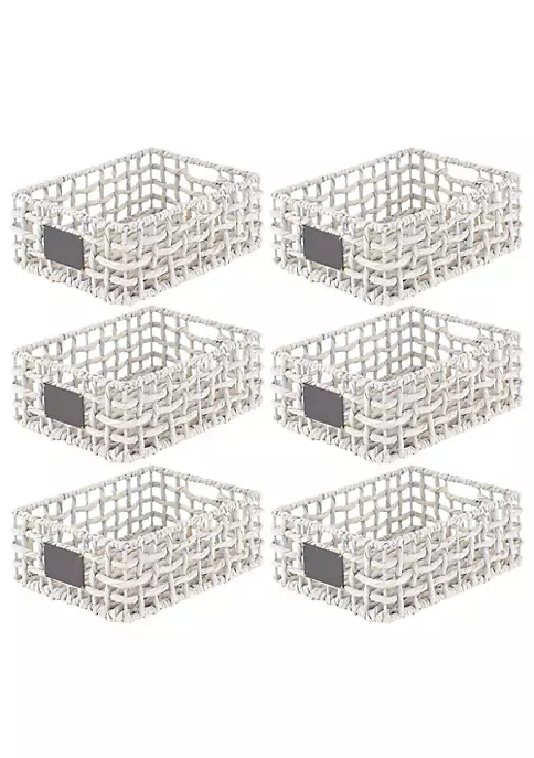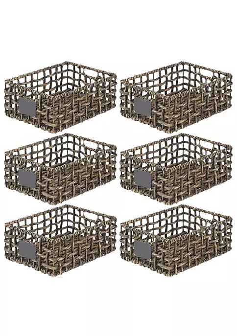 Baskets have integrated, built-in handles making them easy to pull on and off of shelves.Bins have an attached, reusable chalkboard label that makes contents easy to identify.Wipe clean with a damp cloth.Made from natural hyacinth in an open weave design.Dimensions 16″ x 12″ x 6″ high.
