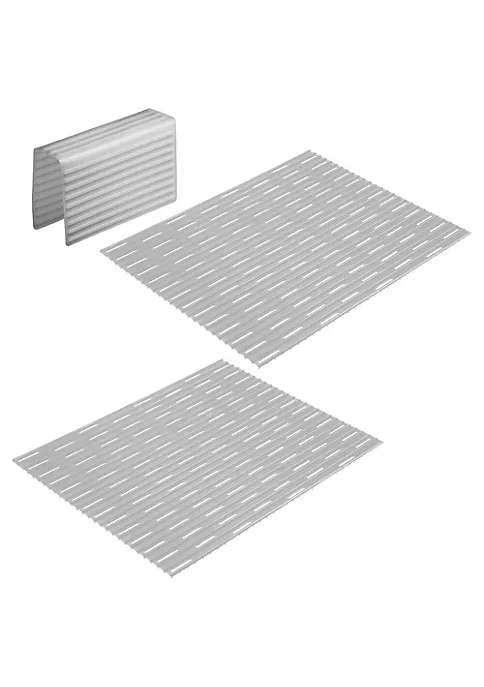 Cut-outs in the design let water flow through quicklyCustomizable mat for a perfect fitClean with mild soap and water; Do not place in dishwasherMade of high grade, heat-resistant and food-safe silicone; BPA freeDimensions Sink Mat: 15.5″ x 12″ x .2″ high; Sink Saddle: 10.3″ x 2″ x 5″ high; Saddle fits over sink dividers up to 1.8″ / 4.5cm thick