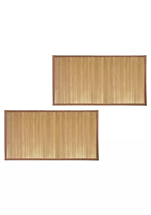 SIMPLE AND ELEGANT: This versatile floor mat is beautiful and functional; Made of natural bamboo lattice slats that are secured together with a woven fabric border, it holds up to daily use and is easy to care for; Set of 2