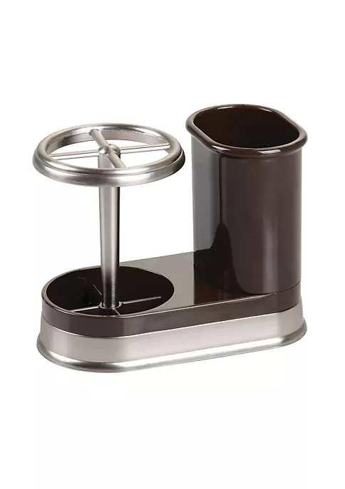 4 open slots for toothbrushes and an attached cup for toothpaste.