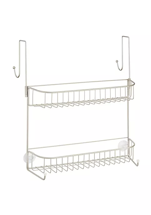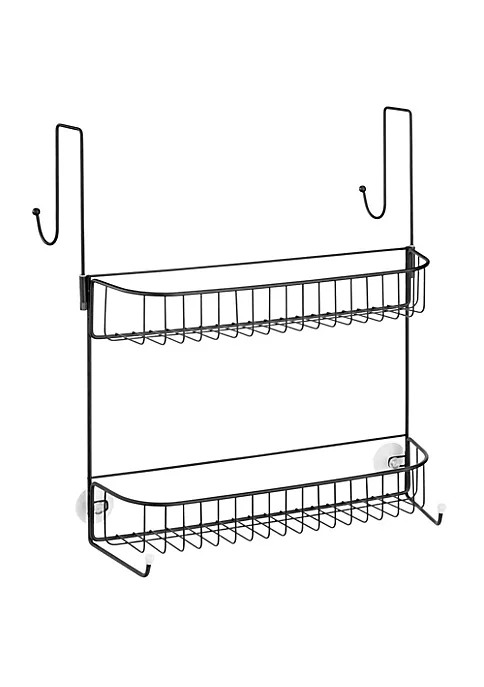 Includes two wide shelf baskets, two large hooks that hang outside the shower and two smaller hooks