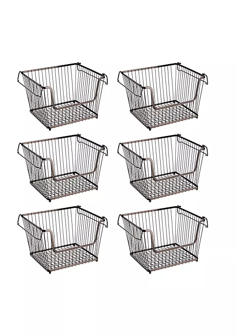 Attached handles for easy carrying, and they fold in so bins can stack.Large front opening for easy access.Open wire design and raised fee for maximum airflow.Easy Care – Wipe clean with damp cloth.Made of strong steel wire with a durable rust-resistant finish.THOUGHTFULLY SIZED: Each Measures 10.7″ x 12.5″ x 8.7″ high.